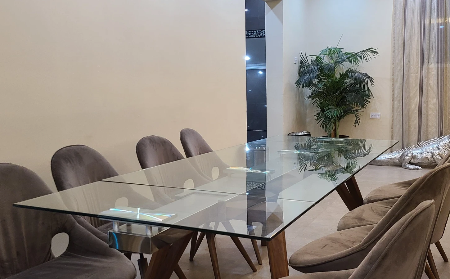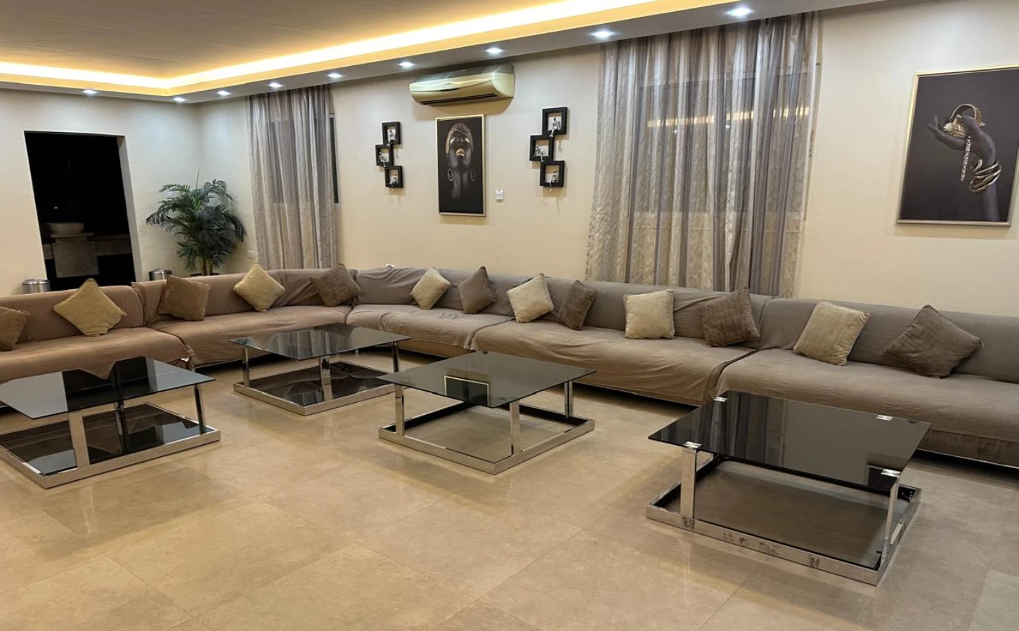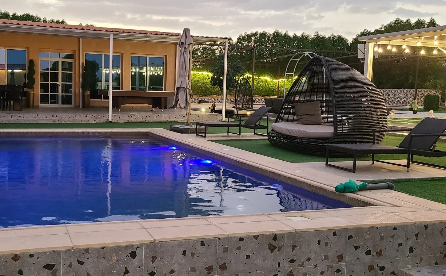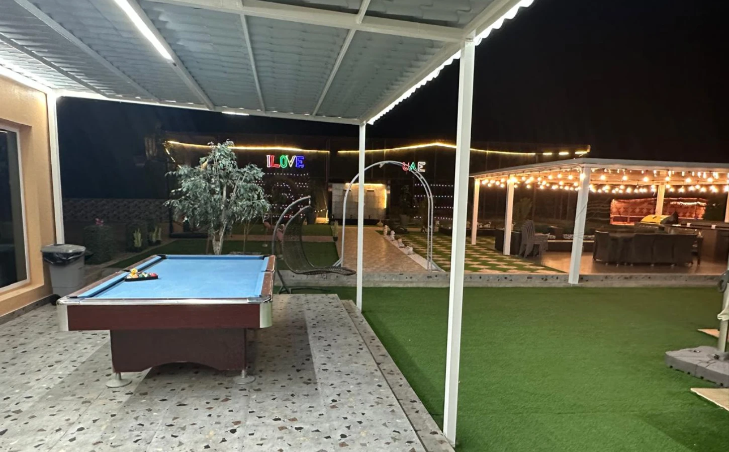 The farm is located in Abu samra are at alain city. offering a serene retreat. The lodge features 3 master rooms, a spacious living room, a swimming pool, a game room equipped with table tennis, a billiard table, and a TV.