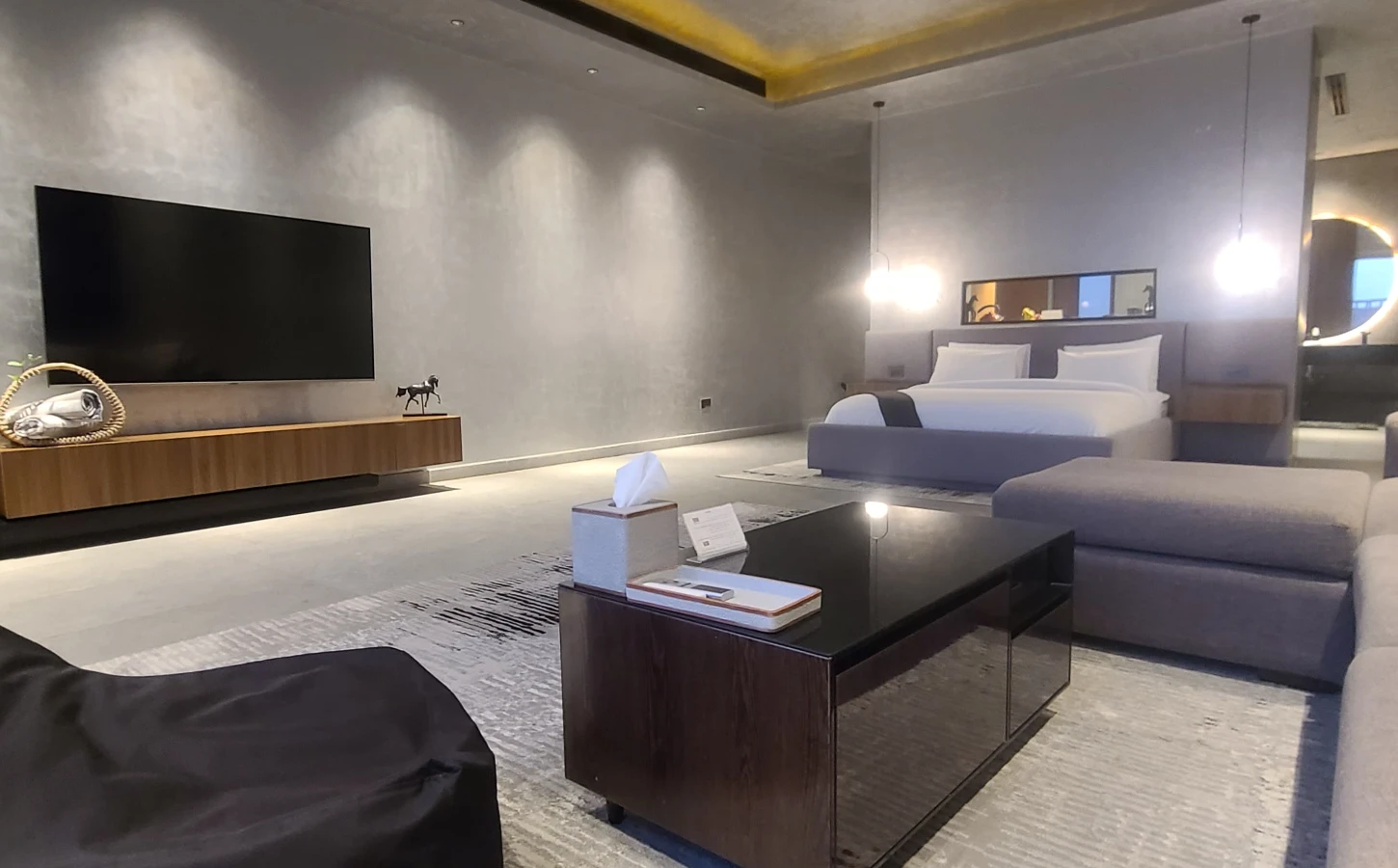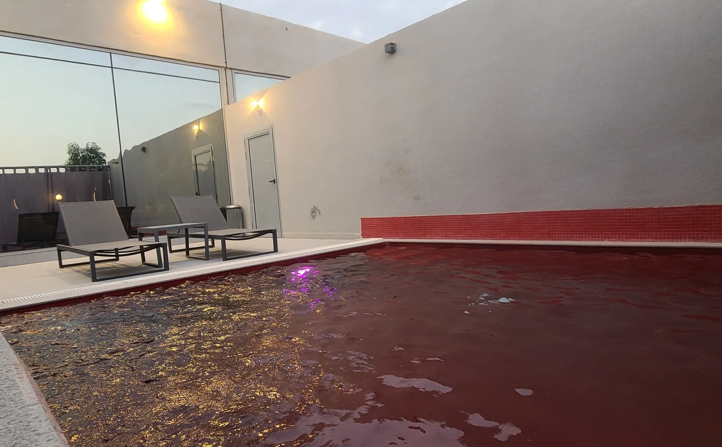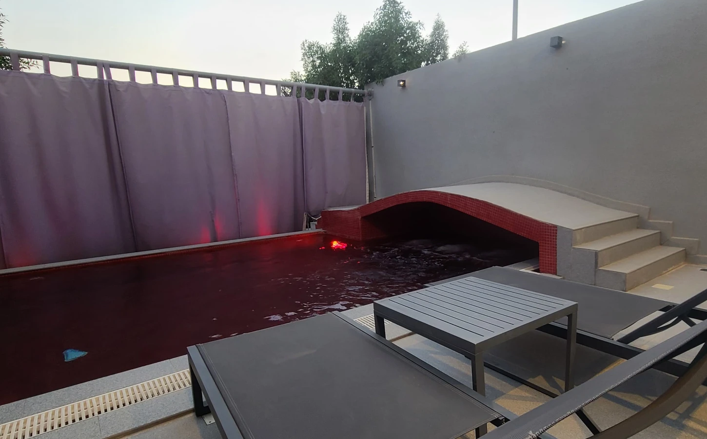 This villa is located in Dubai. It features an open bedroom that leads to a spacious living area overlooking a private, distinctive swimming pool. The pool has a depth of approximately 1.4 meters and dimensions of 4×6 meters, along with a jacuzzi. Equipped with a cooling and heating system, the pool offers year-round enjoyment for swimming and relaxation.