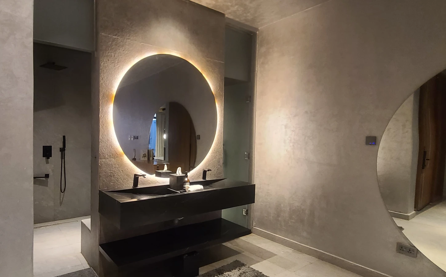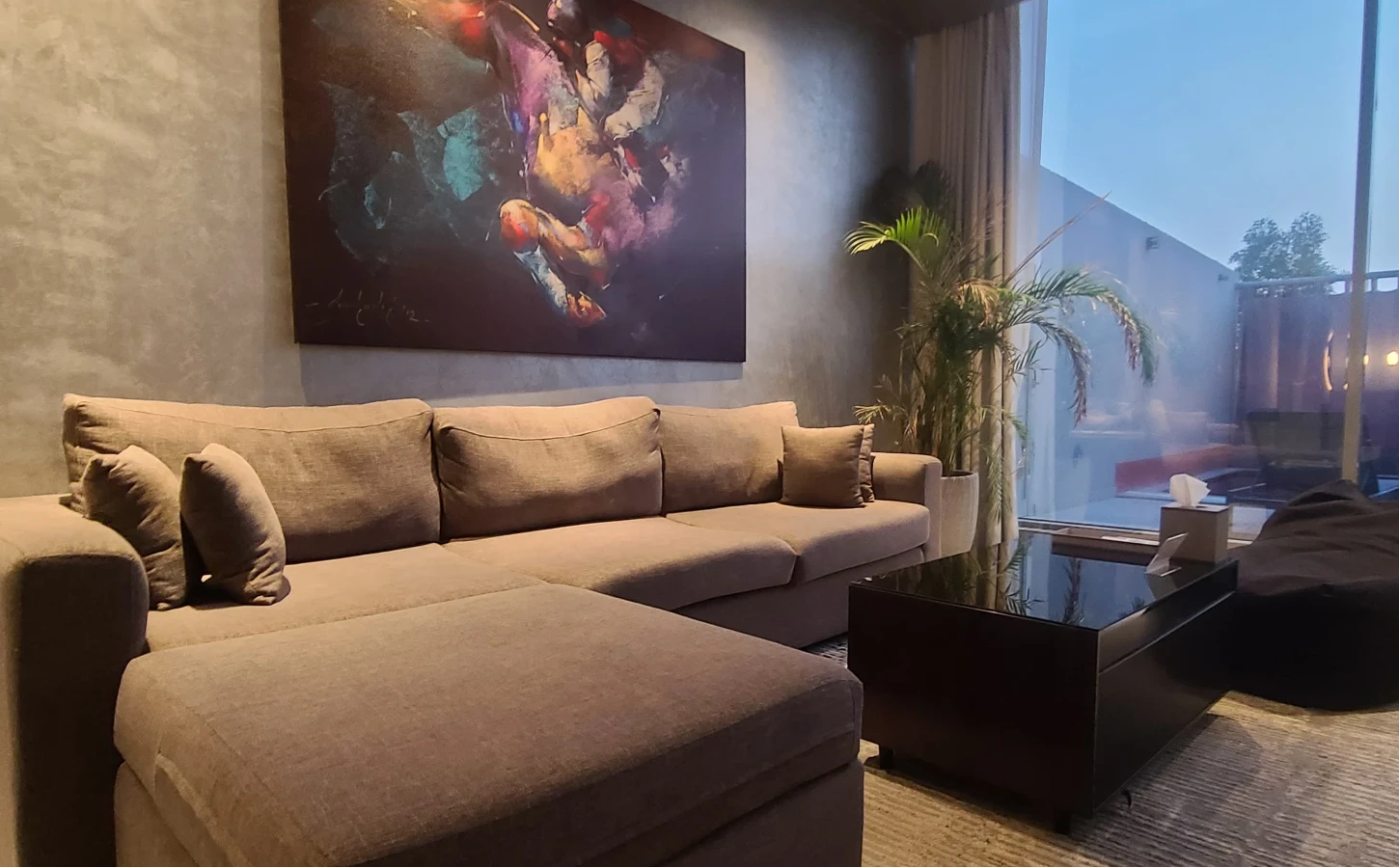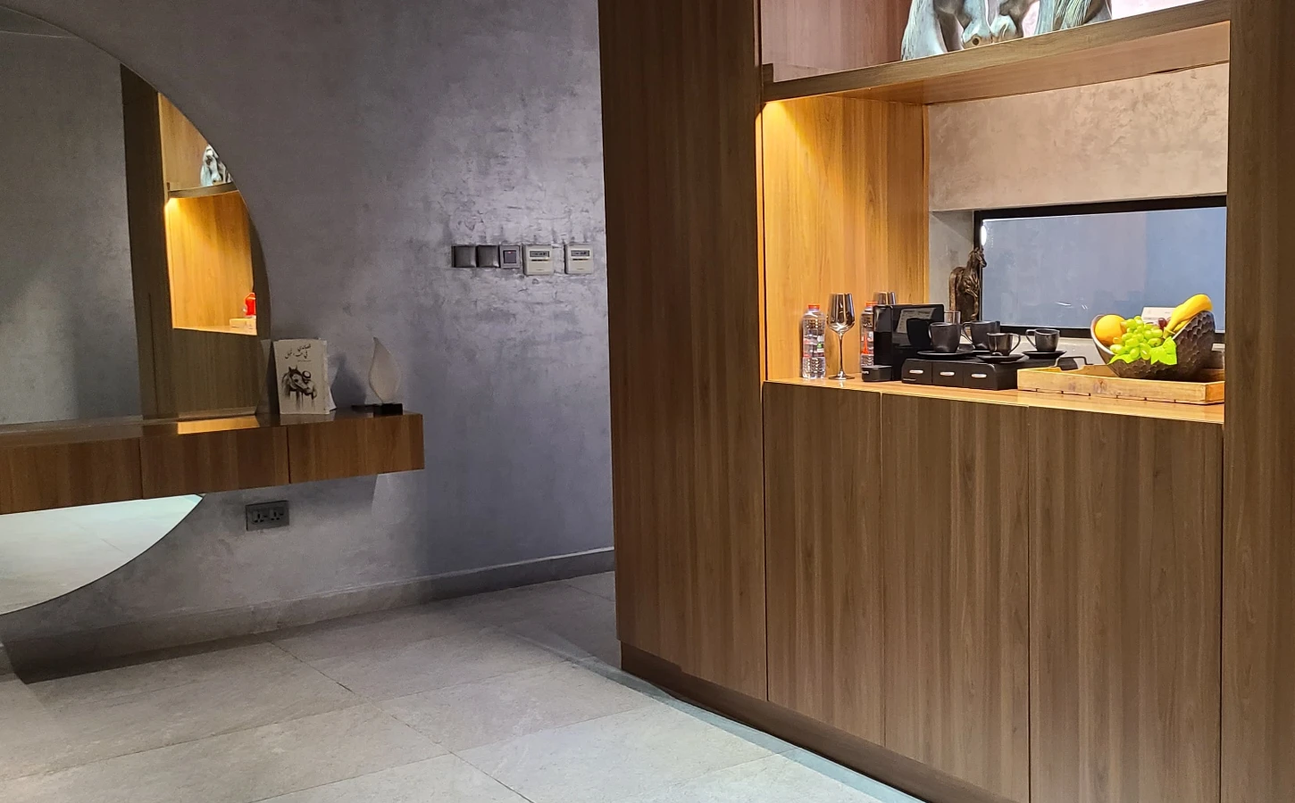 This villa is located in Dubai. It features an open bedroom that leads to a spacious living area overlooking a private, distinctive swimming pool. The pool has a depth of approximately 1.4 meters and dimensions of 4×6 meters, along with a jacuzzi. Equipped with a cooling and heating system, the pool offers year-round enjoyment for swimming and relaxation.