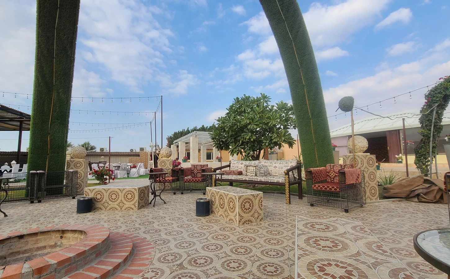 Located in the tranquil Al Awir area of Dubai, this farmhouse provides an ideal retreat for families and friends. The property features a spacious outdoor seating area, a well-equipped barbecue section, a luxury tent for a unique glamping experience, and a swimming pool with sections for both adults and children.