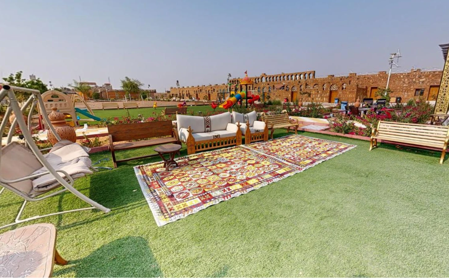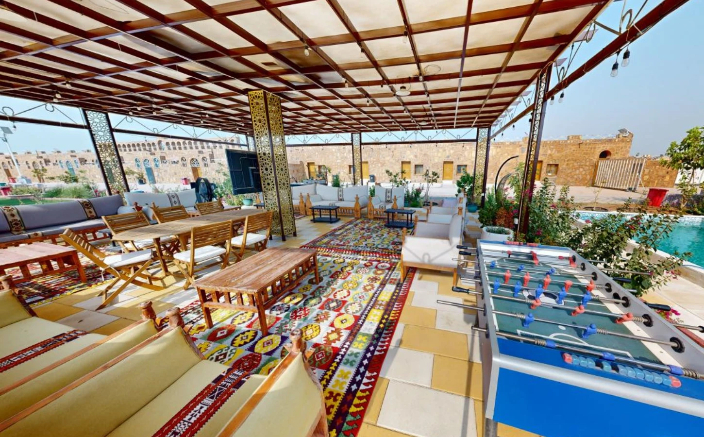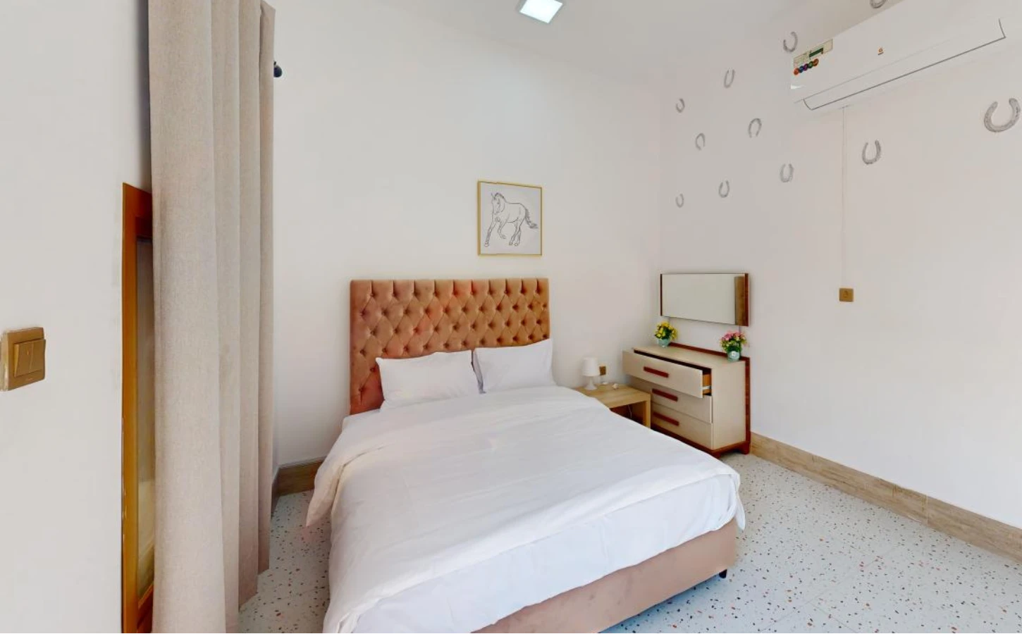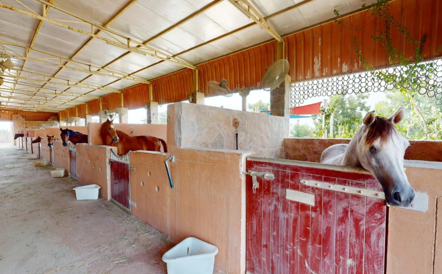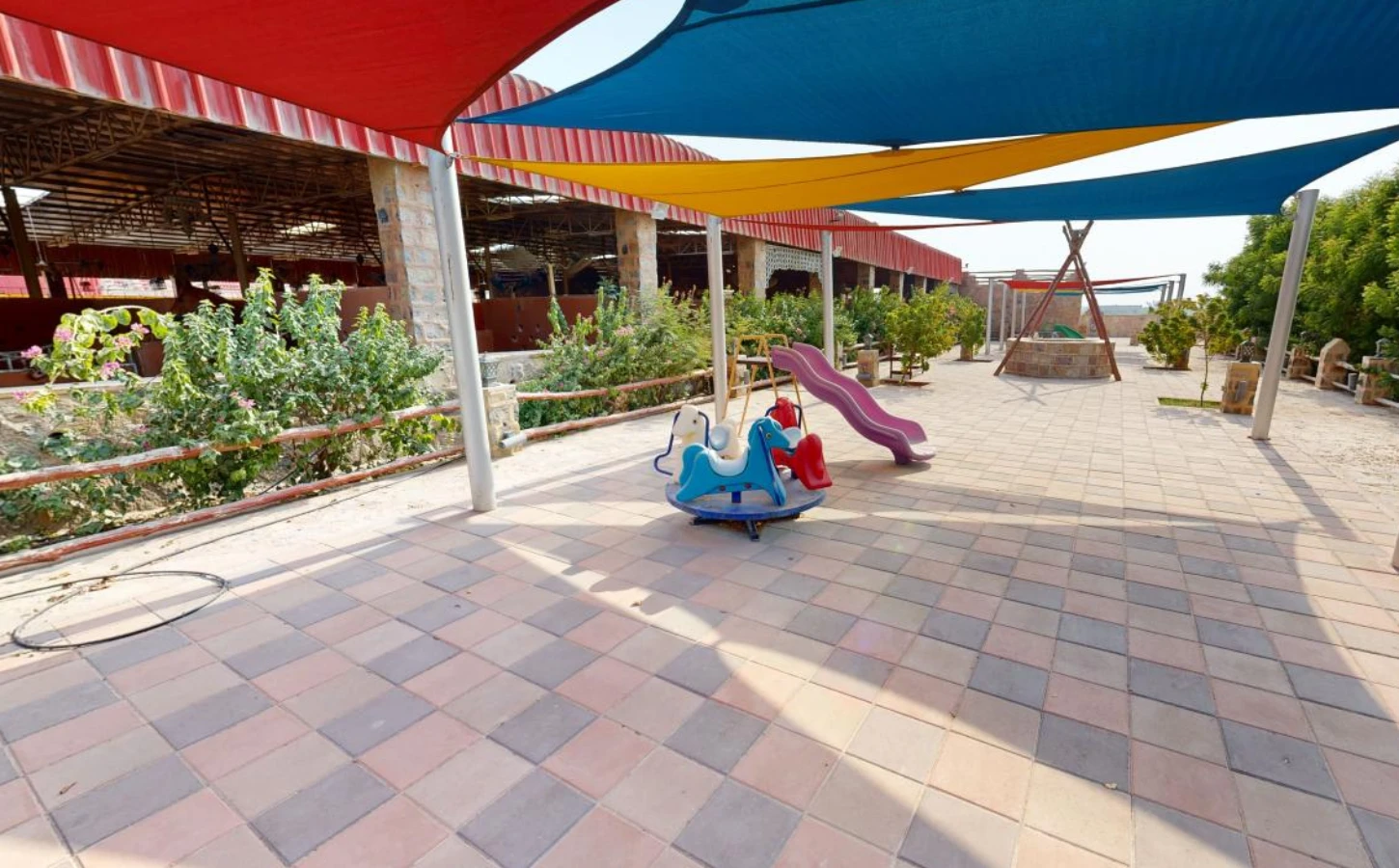 The farm is located in the Medfek area of Ras Al Khaimah, the farmhouse showcases a traditional and historical design. This charming retreat offers a variety of entertainment options, including TV, Wi-Fi, a children’s playground, and swimming pools for both adults and children. Guests can relax in several outdoor seating areas and enjoy horse riding at a designated area for an additional fee, all while admiring the beautiful view of the green areas and enjoy seeing horse stables.