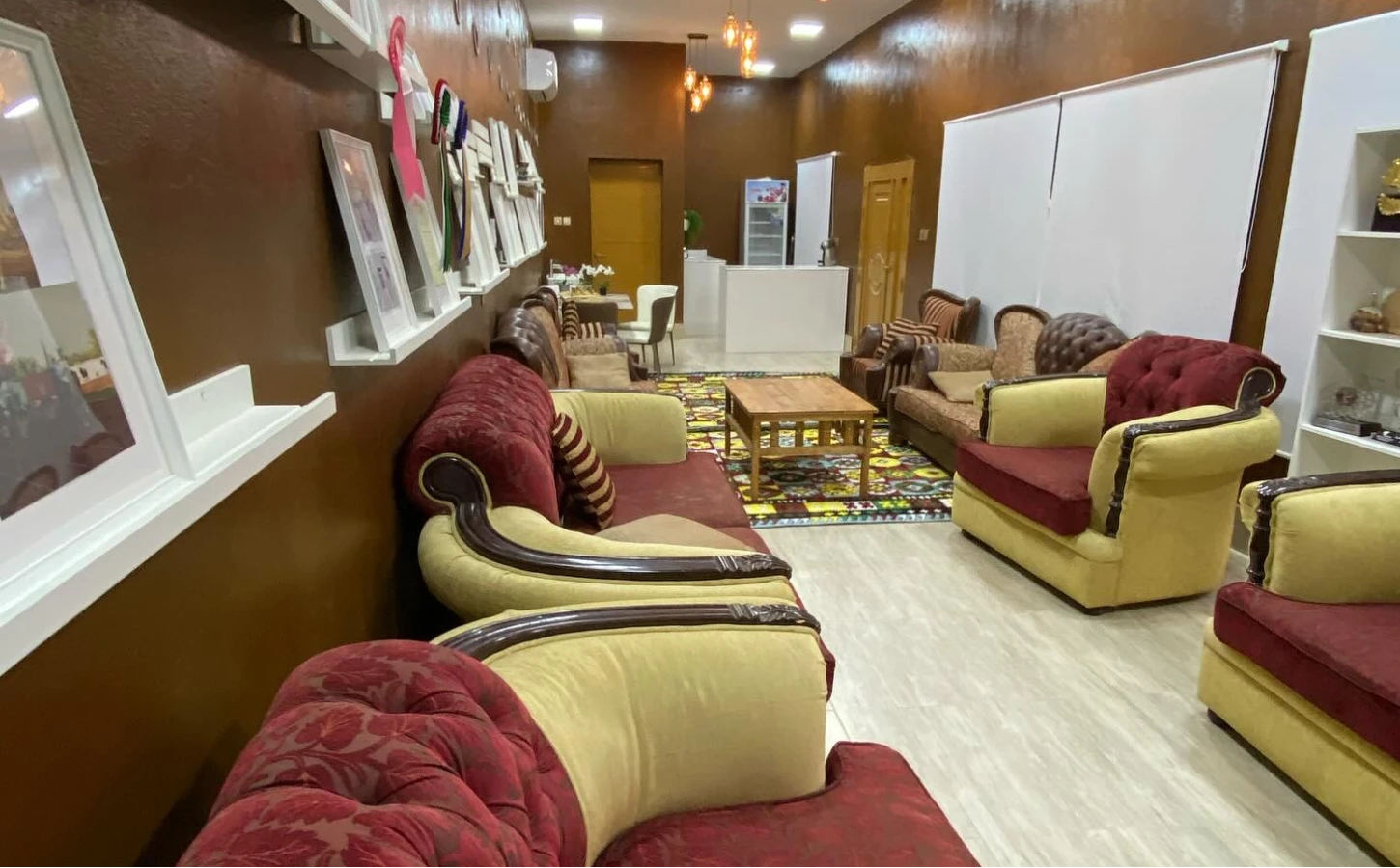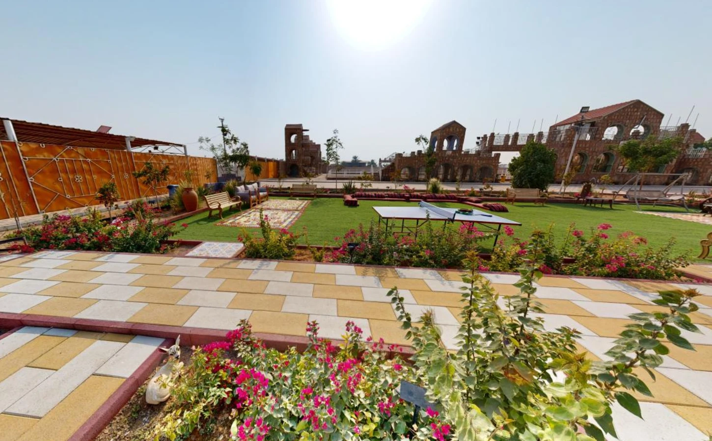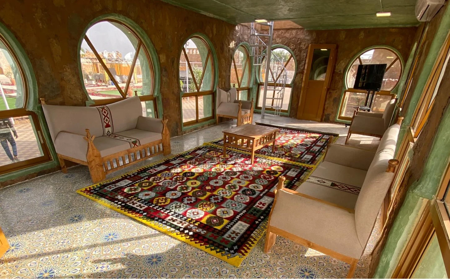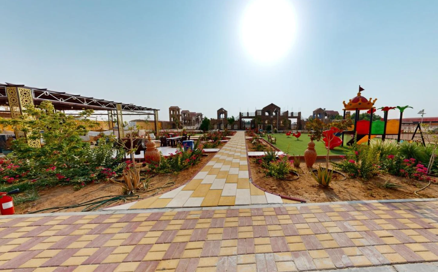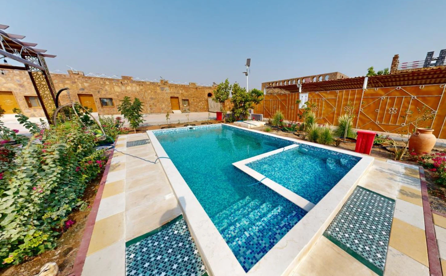 The farm is located in the Medfek area of Ras Al Khaimah, the farmhouse showcases a traditional and historical design. This charming retreat offers a variety of entertainment options, including TV, Wi-Fi, a children’s playground, and swimming pools for both adults and children. Guests can relax in several outdoor seating areas and enjoy horse riding at a designated area for an additional fee, all while admiring the beautiful view of the green areas and enjoy seeing horse stables.